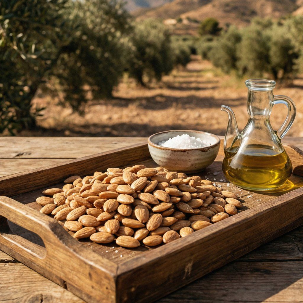 K výrobě nejlepšího snacku na světě toho nepotřebujete moc. My používáme jen tři ingredience. Základem jsou špičkové mandle odrůdy Valencia z jihu Španělska, ceněné pro svůj plný tvar a nasládlý podtón. Ty šetrně a pomalu pražíme v kvalitním slunečnicovém oleji, dokud nezískají svou typickou zlatavou barvu.