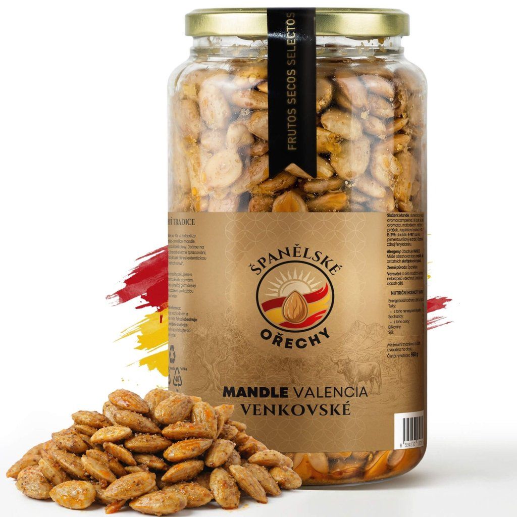 Hledáte něco víc než jen klasické solené oříšky? Naše Mandle Valencia Venkovské přinášejí na váš stůl explozi tradičních španělských chutí. Tento téměř kilový klenot v sobě ukrývá to nejlepší z naší pražírny – prémiové křupavé mandle a delikátní kořenící směs „Campesina“, která vaše chuťové pohárky doslova roztančí. Toto bohaté 950g balení je zárukou, že o skvělé pohoštění na vaší další oslavě bude postaráno.